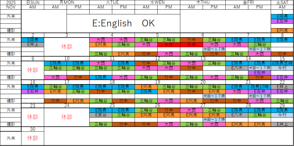 一般外来・健診の担当医が確認できます。(日付の下の左が午前・右が午後)